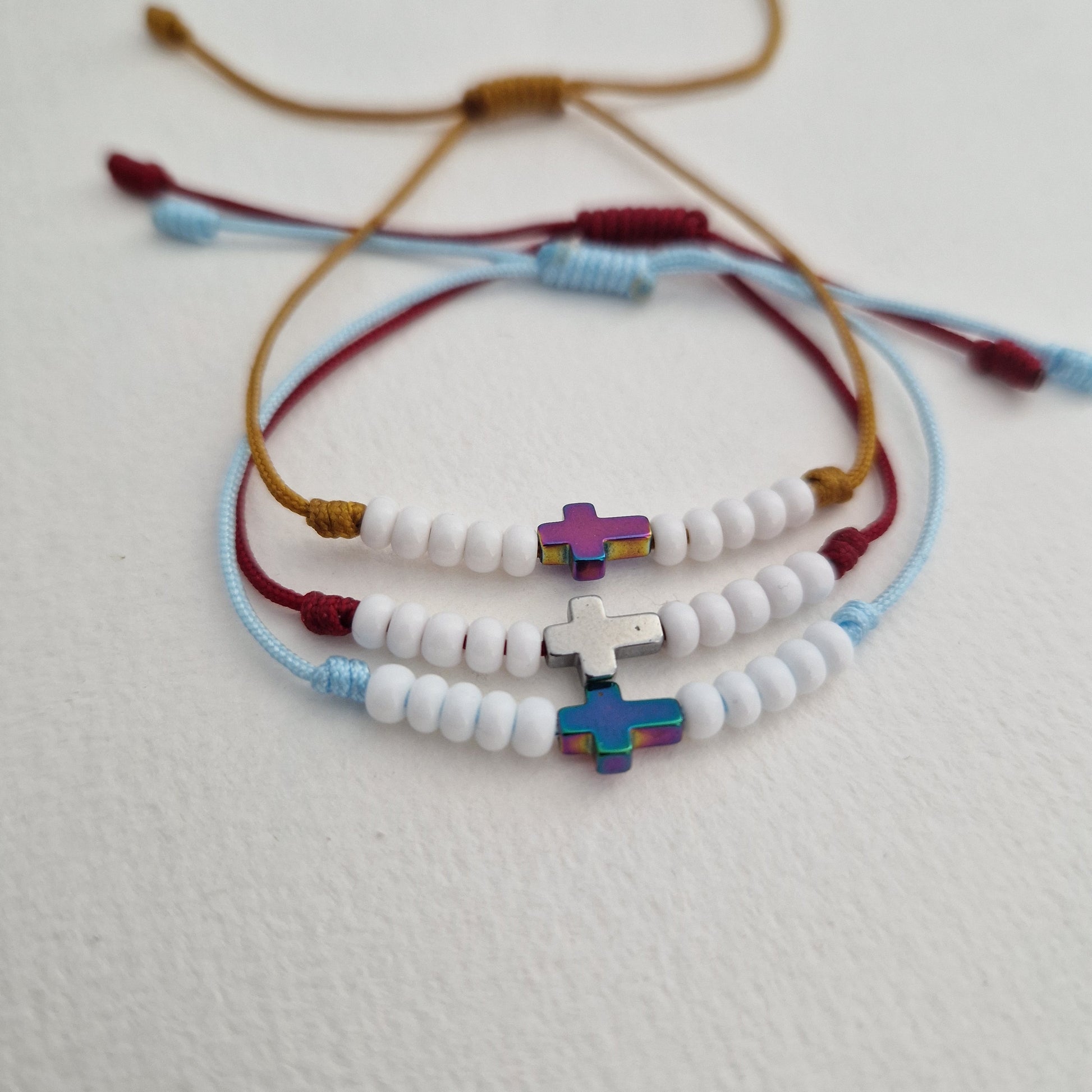 La pulsera Noé es un detalle perfecto para tus invitados, con su diseño ajustable de cuentas blancas y cruz de mineral hematita. ¡Sorprende a tus invitados con este detalle especial!